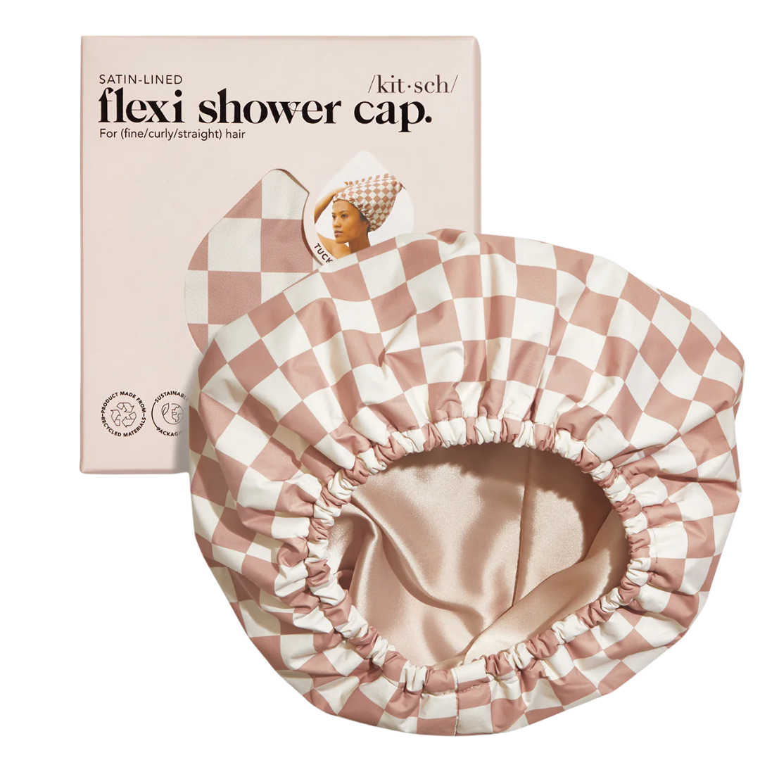 Satin Lined Flexi Shower Cap - Terracotta Checker