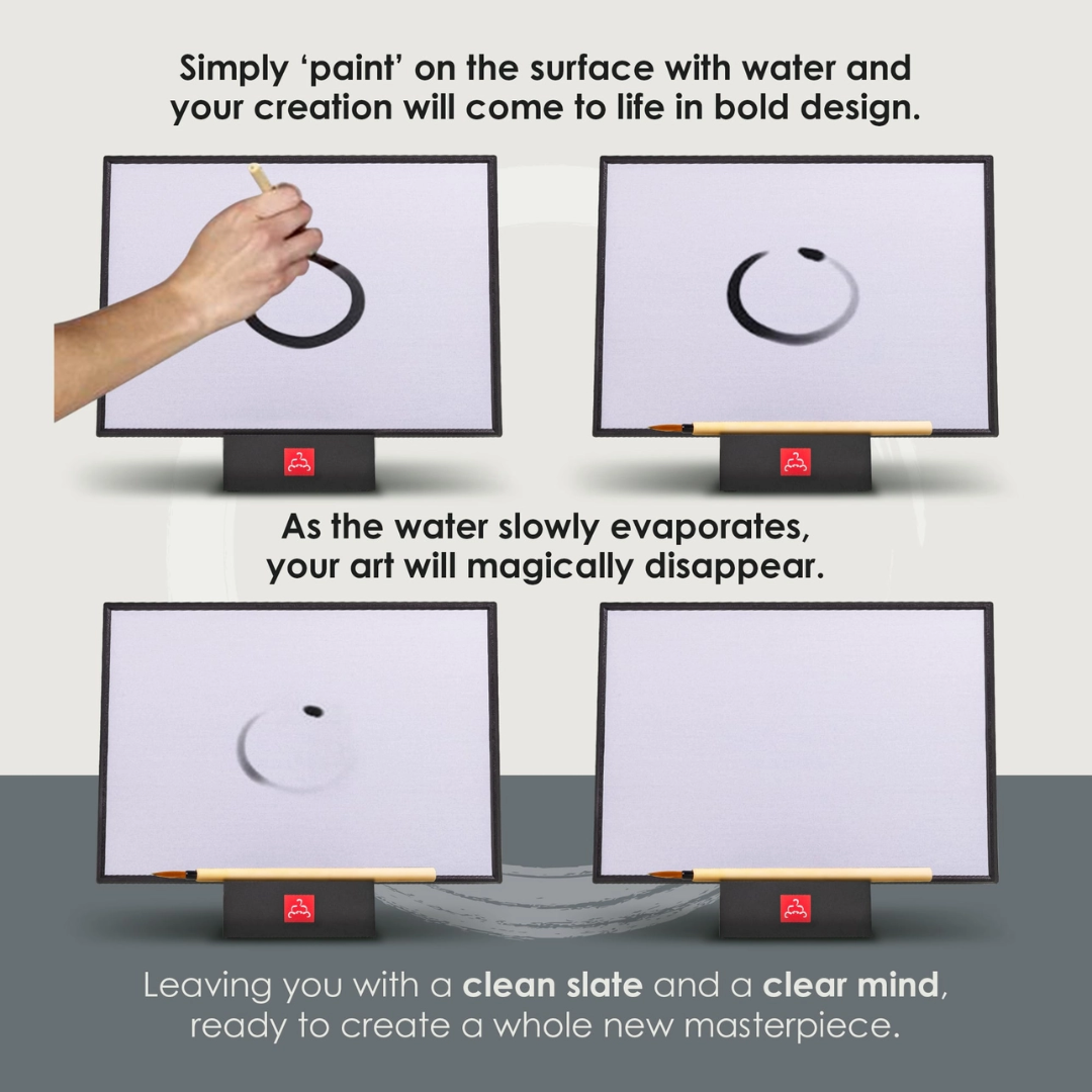Master the art of letting go with the Original Buddha Board. Environmentally friendly and reusable, the Original Buddha board is designed with a waterproof stand, complete with a roomy reservoir for water & separate grooves for holding both the board & bamboo brush.