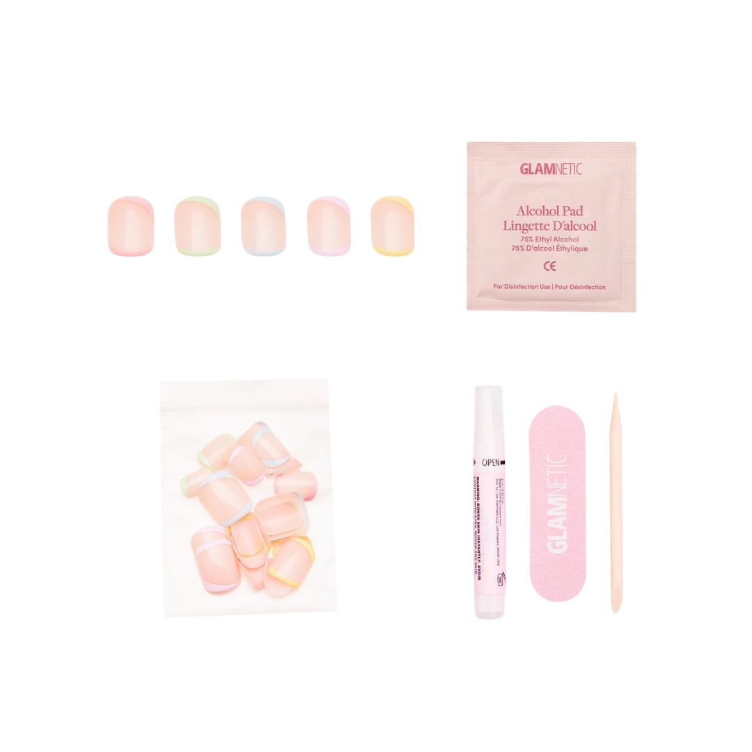 Show off your style game, from your head to your fingertips! This classic look offers a playful twist with multicolor pastel designs adorning the tips and base.  adding a soft, charming detail to your everyday manicure.