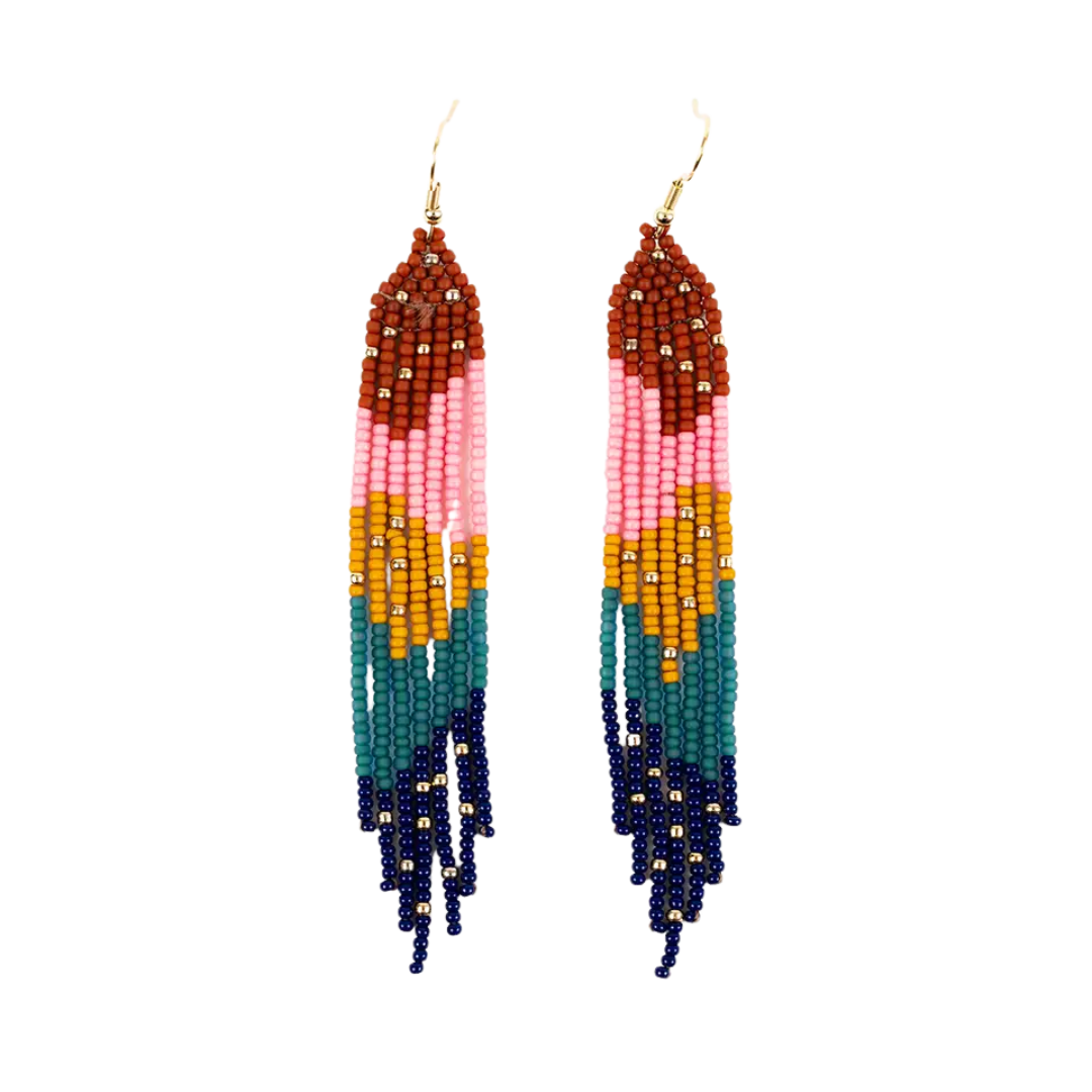 Cascading strands of colorful glass seed beads are accented with shimmering 24k gold-plated Japanese glass beads, making the Strata Fringe with Gold Sprinkles Earrings a dazzling statement piece. ✨ Secured with gold-plated brass ear wires, these lightweight fringe earrings add movement, texture, and sparkle to any look.