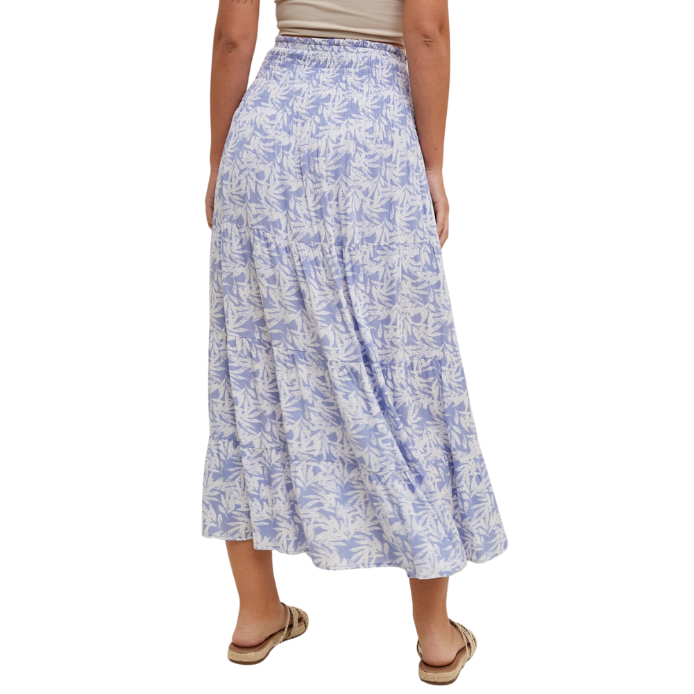 Bring the vacation vibes wherever you go with this Blue Tropical Tiered Midi Skirt. Featuring a flowy tiered silhouette, smocked waistband for ultimate comfort, and a side slit for that perfect breezy touch. Fully lined for easy wear, it's your go-to for warm days and tropical dreams.
