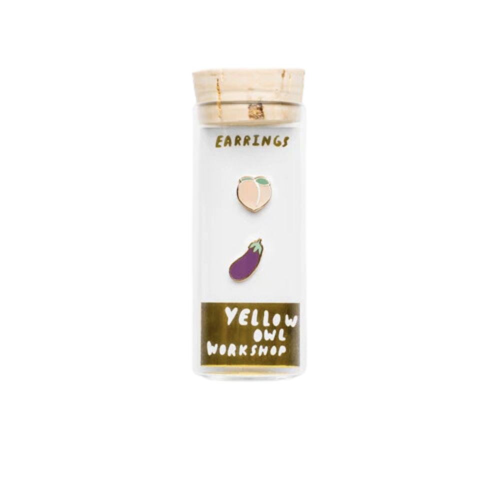 A playful pair with a cheeky twist! These mismatched yet perfectly paired cloisonné petite studs feature a juicy peach and a bold eggplant, making them the ultimate conversation starter. Whether you love fruit, emojis, or just a little fun in your jewelry collection, these studs are made for you!