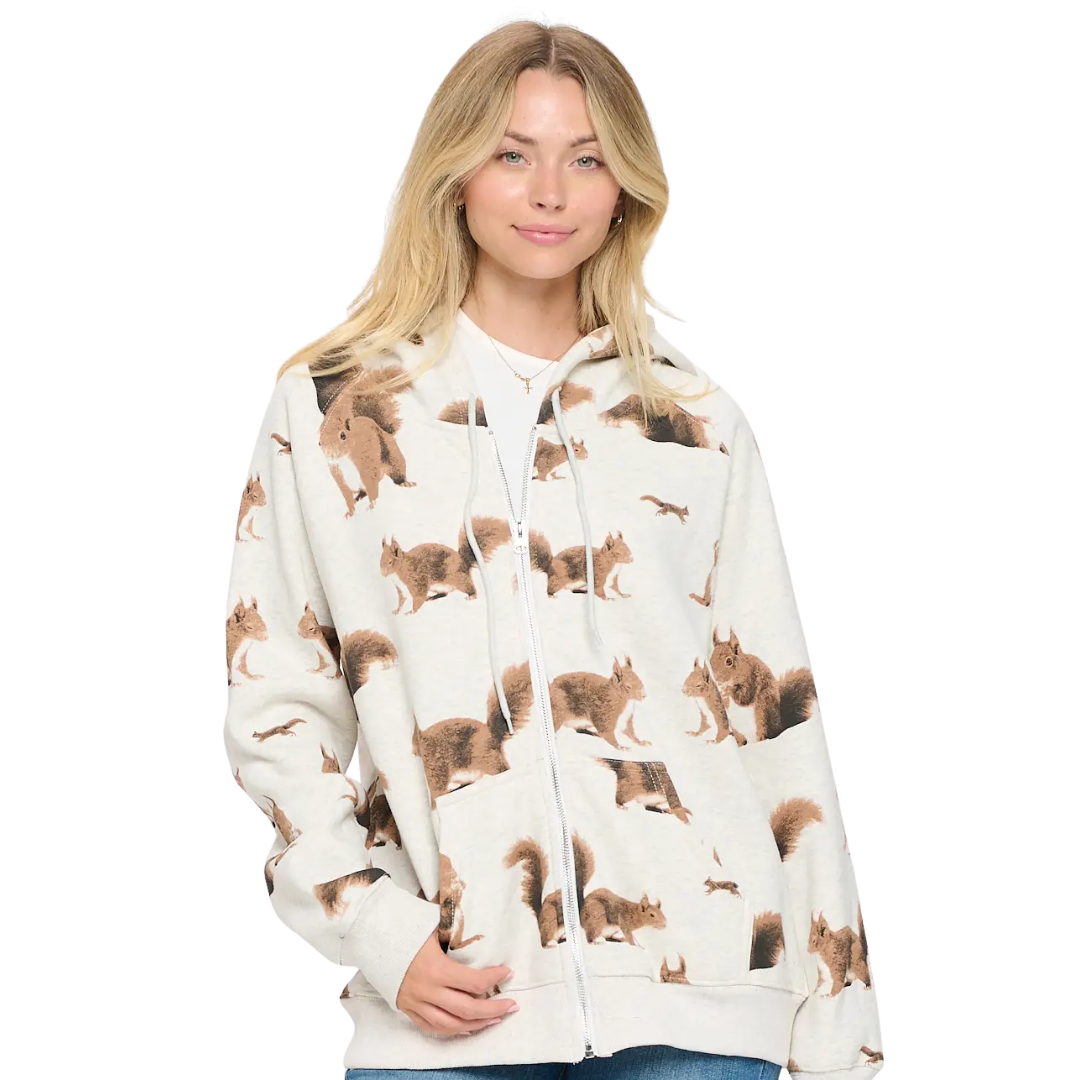 Squirrel Print Zip Up Hoodie