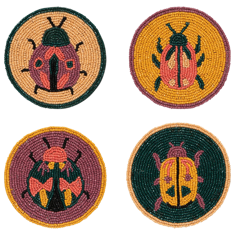 Bring a touch of artistry and protection to your table with these hand-beaded coasters from Danica Studio’s Amulet Collection. Each design radiates from the surface in shimmering dyed glass beads, showcasing delicately detailed creatures — including a striking beetle motif symbolizing resilience and protection. With a strong cotton fabric backing, these coasters are crafted to last while adding a bit of magic to your everyday moments.