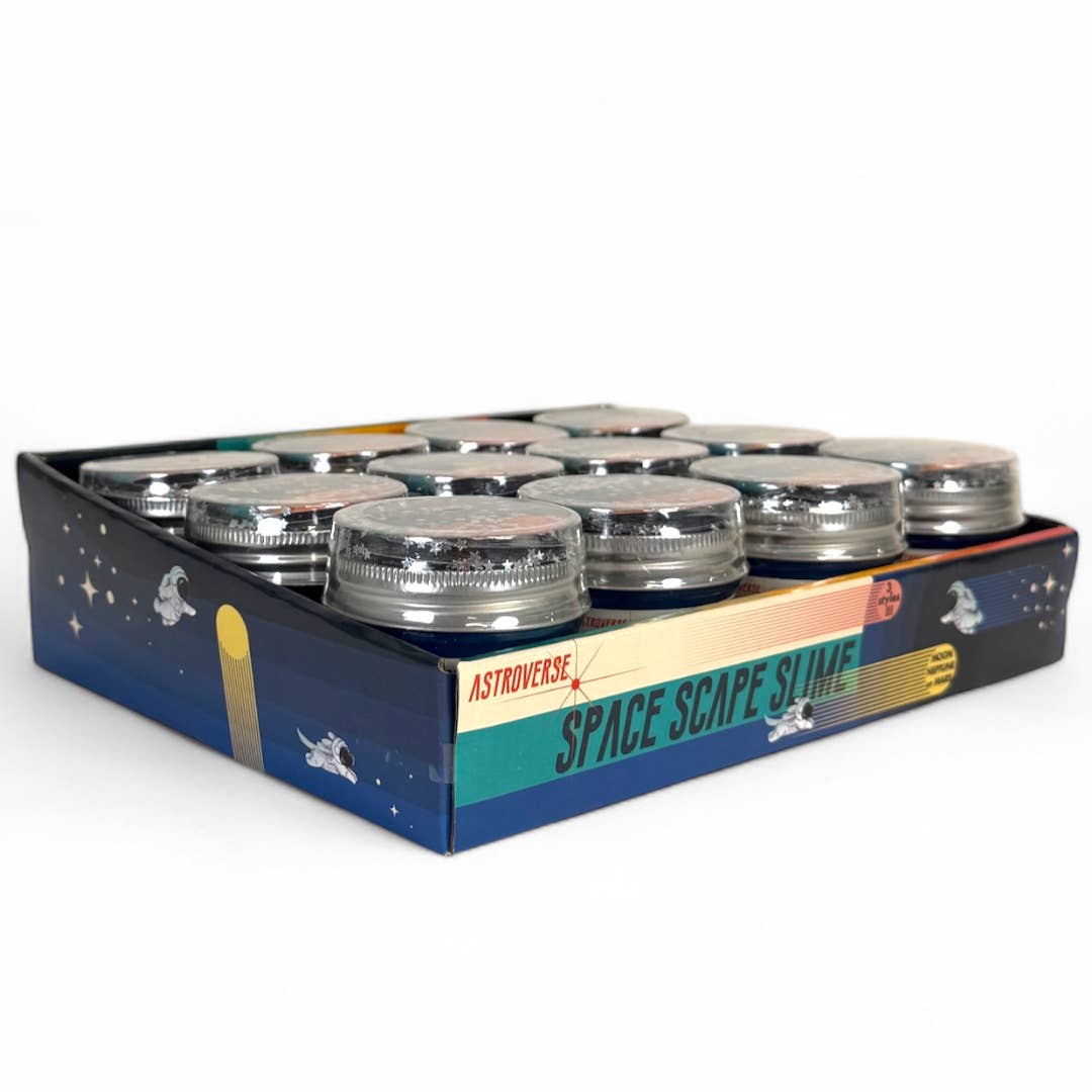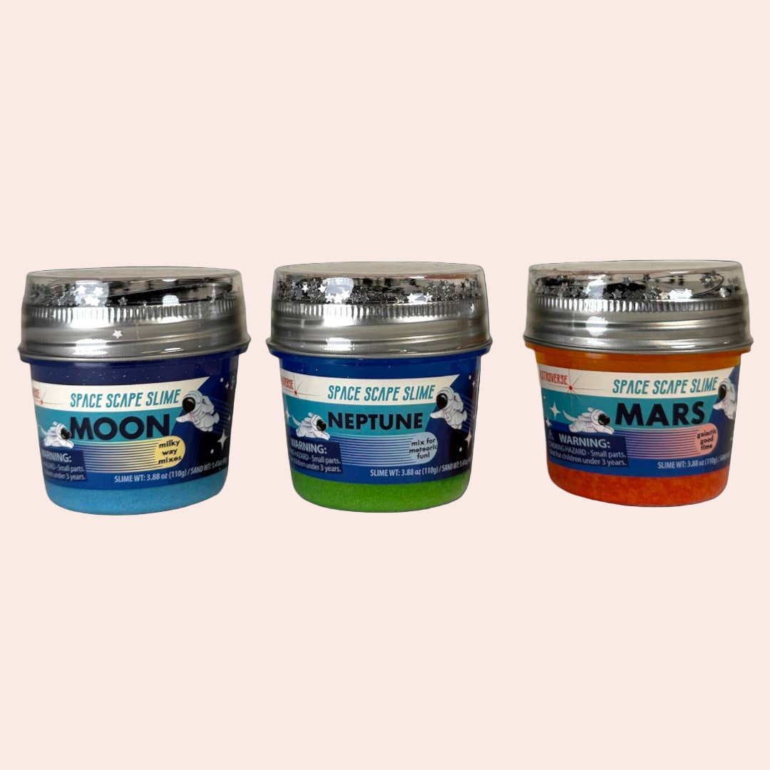 Blast off into sensory fun with Astroverse Space Scape Slime! Each jar is packed with shimmering, stretchy slime in two cosmic colors plus sparkling star confetti, making every swirl feel like a little galaxy in your hands. Even cooler—every slime comes with a mini packet of scientific facts about the Moon, Mars, or Neptune, so you can play and learn at the same time!