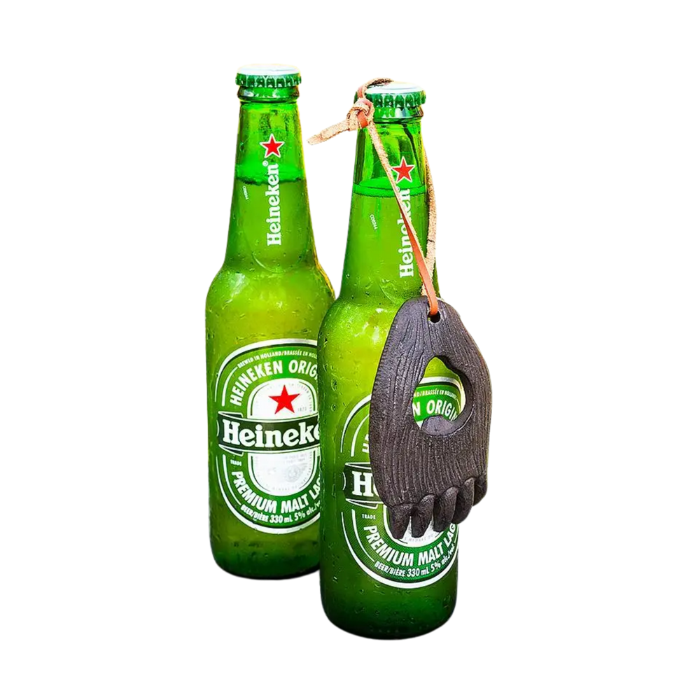 Crack open your next cold one with a little help from the wild side! This rustic cast iron bottle opener is shaped like a bear paw—complete with textured details that make it look like it just stepped out of the forest. Finished with a leather loop for easy hanging, it’s the perfect companion for cabins, lake houses, and cozy rec room vibes.