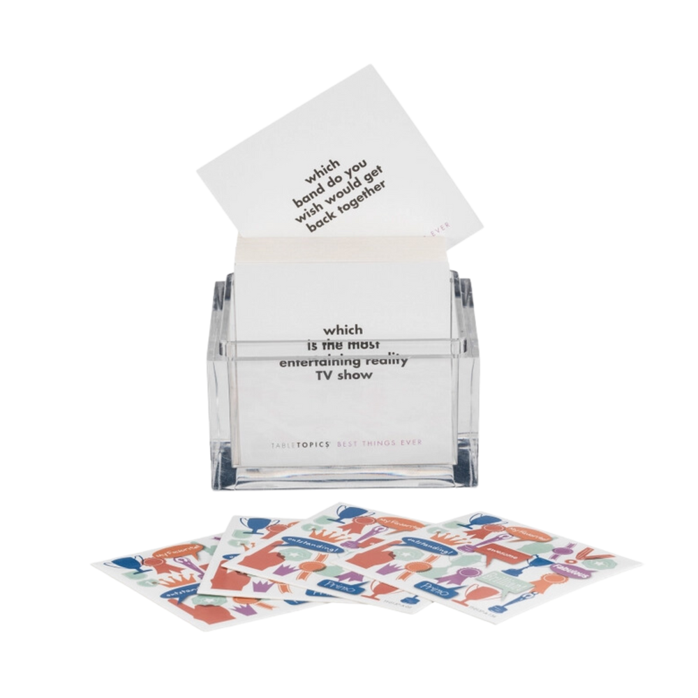 135 question cards in a 4" x 4" x 4" clear, acrylic cube. Ages 12 and up