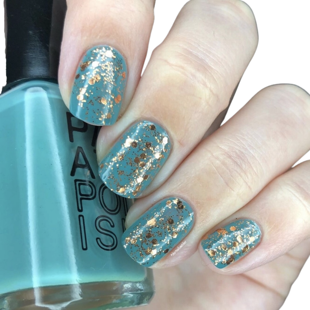 One full sized bottle of nail polish (0.5 oz/15 ml) in Candied Ginger, a chunky brownish-gold. Glitter suspended in clear coat. All bottles come with 2 stainless steel mixing balls.