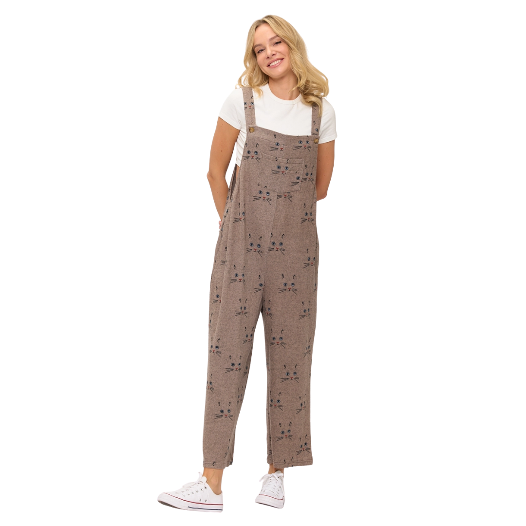 Embrace feline charm in these cozy cat whiskers print overalls! Featuring an all-over design of stylized kitty faces with bright blue eyes and playful whiskers, the print pops against a warm heathered background for a whimsical, endearing vibe. Made from plush, soft fabric, these overalls include adjustable straps, a roomy bib pocket, and handy side pockets—perfect for layering over your favorite tee or sweater. A fun, versatile piece for casual days, creative projects, or showing off your cat-loving spirit.
