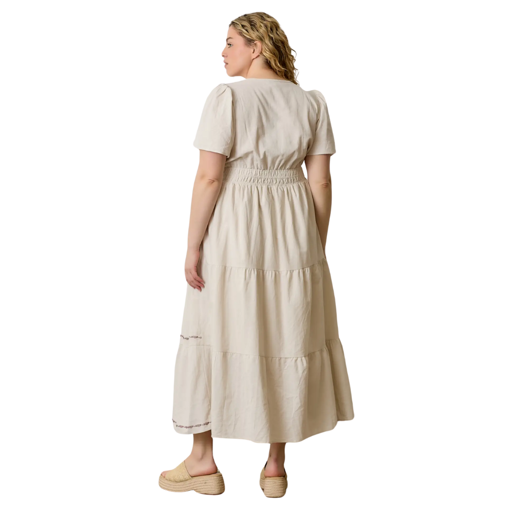 Featuring a flattering v-neck, short sleeves for warm-weather ease, and yes — it has pockets 🙌. The tiered silhouette flows effortlessly, while the embroidered floral details add a sweet, artful touch. A forever favorite for brunch dates, garden parties, or just feelin’ fancy on a Tuesday. 💐