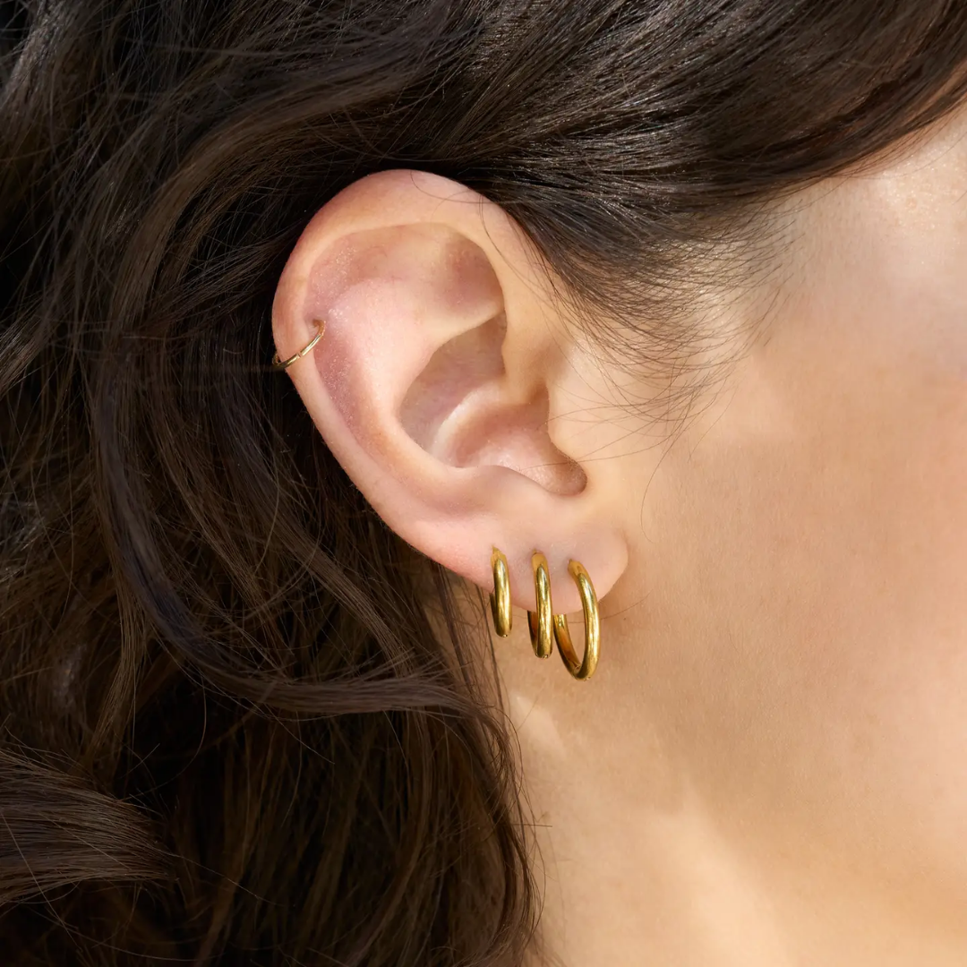 A classic essential with everyday versatility. These sleek hoops are designed for effortless styling, whether worn solo or stacked.