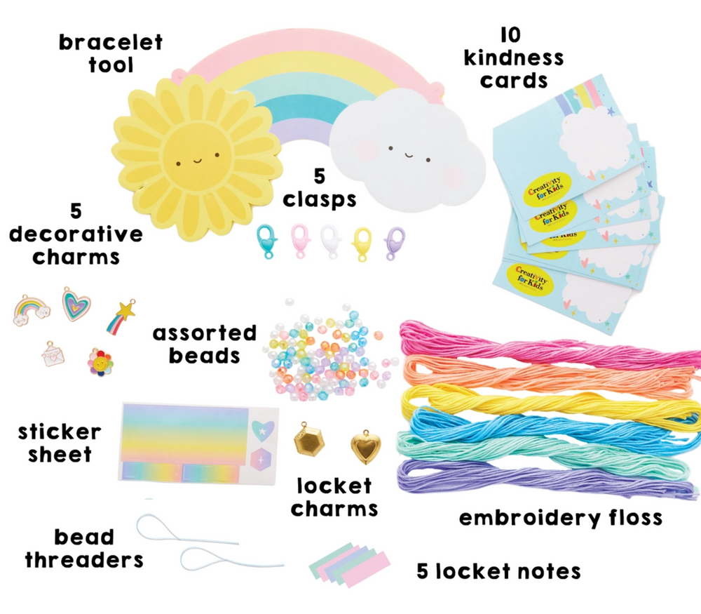 With Friendship Bracelets, you will learn 4 beautiful braid techniques: basic, beaded, rope and scrunchy. There is enough embroidery floss included to make and share up to 20 colorful bracelets with your closest friends and family members. Illustrated instructions and video tutorial make it easy for beginners to follow. Use the unique rainbow tool to create your bracelets and later, use it to organize and display your creations in your room. Accessorize your bracelets with assorted beads, uplifting charms, decorative lockets and colorful clasps.