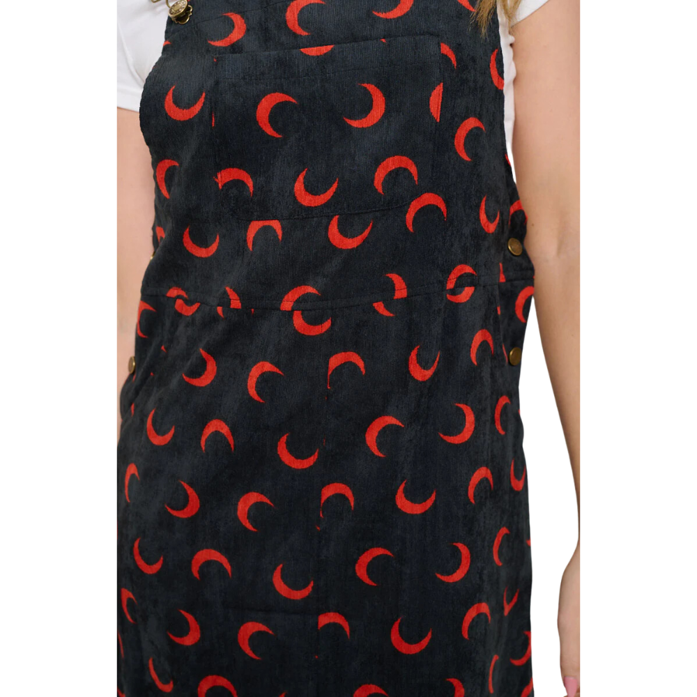 🌙 Half Moon Print Corduroy Jumper Dress – Red & Radiant Style!