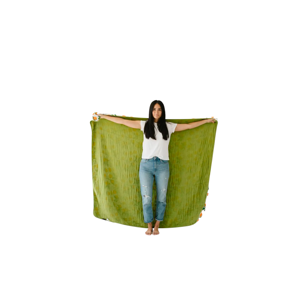 The Clementine Throw Blanket is perfect for big kid beds (it will fit nicely on a twin!) or a cozy blanket to curl up with\ on the couch. One side is our signature clementine pattern, and the other is a lovely spring green.