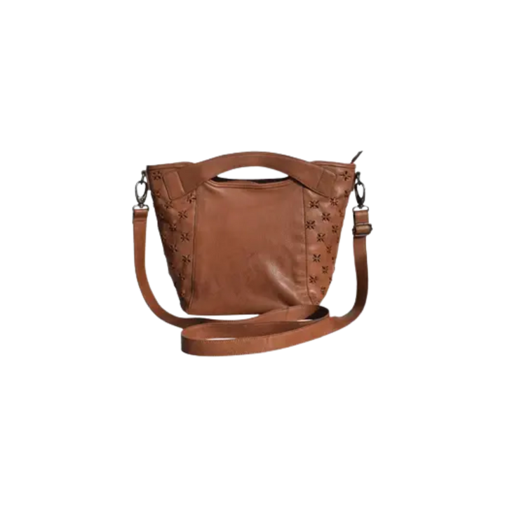 100% Leather, Handcrafted by artisans in South America and India 1" wide adjustable/detachable crossbody strap with 28" max, 14" min drop. Two top handles 1"wide, 2" drop Exterior features laser cut and handwoven detail and back zip pocket Interior features 2 open pockets, zip pocket, leather organizer with 3 pen holders, open slip pocket, and 4 leather credit card slots. Fabric lining