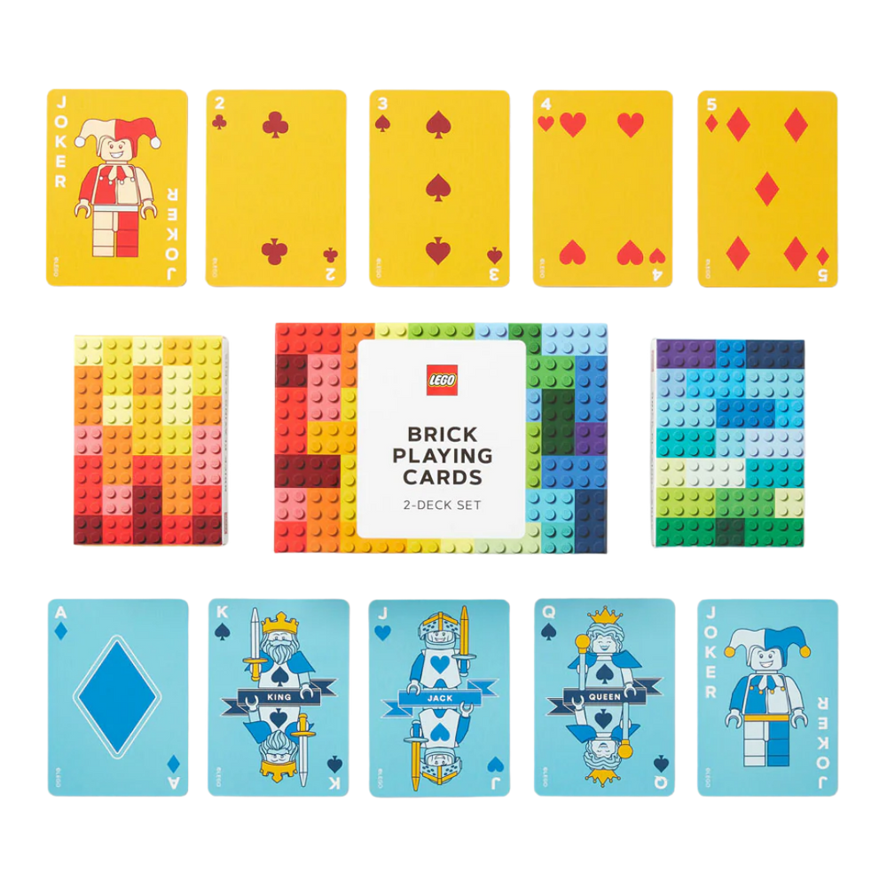 A playful twist on a classic game night staple. This deluxe set includes two standard decks of playing cards, each featuring vibrant LEGO brick designs on the backs.