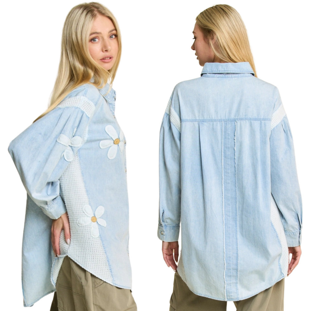 🌼 Lightweight Chambray Daisy Patch Button-Up Top 💙