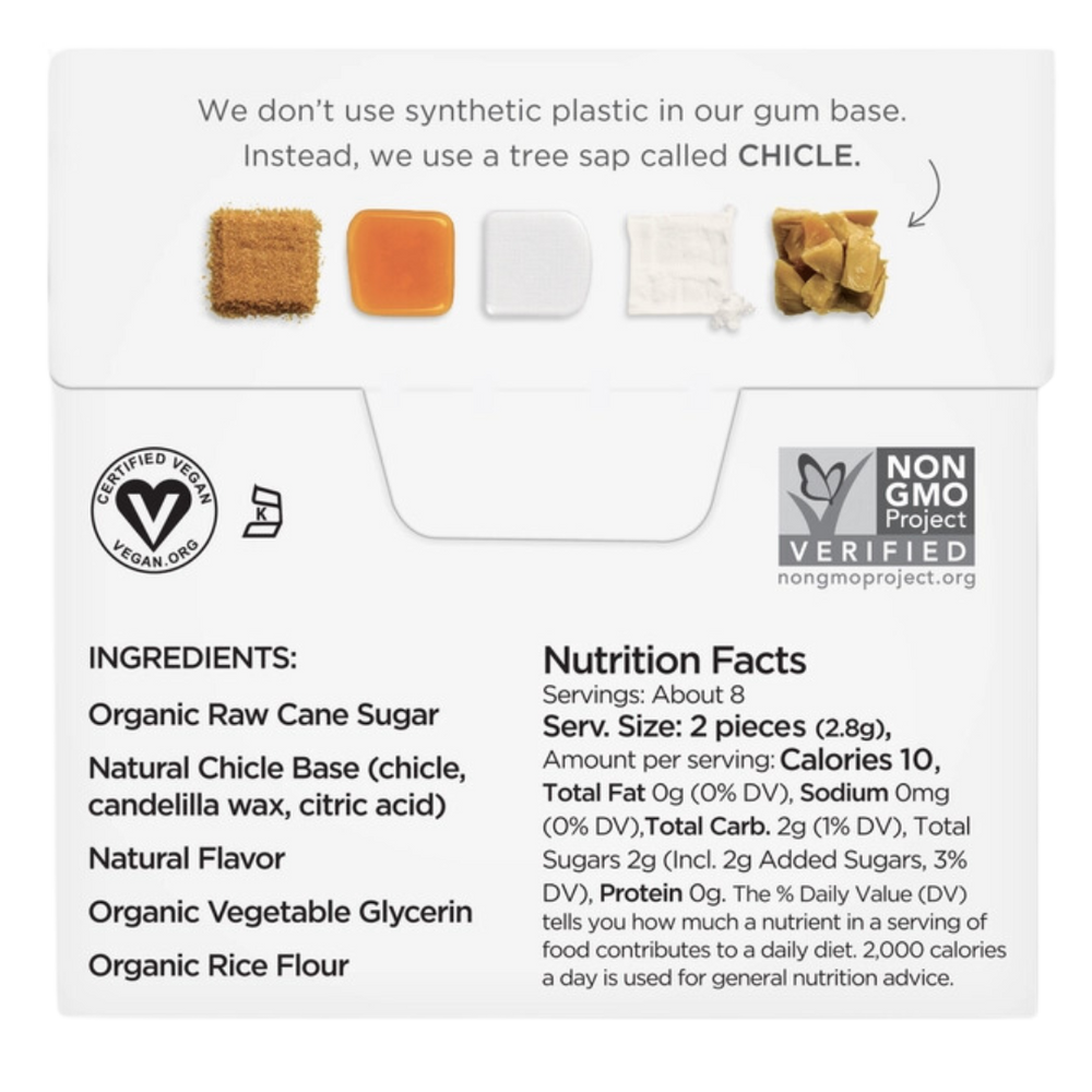 Ingredients: Organic Raw Cane Sugar, Natural Chicle Base (chicle, candelilla wax, citric acid), Natural Flavor, Organic Vegetable Glycerin, Organic Rice Flour