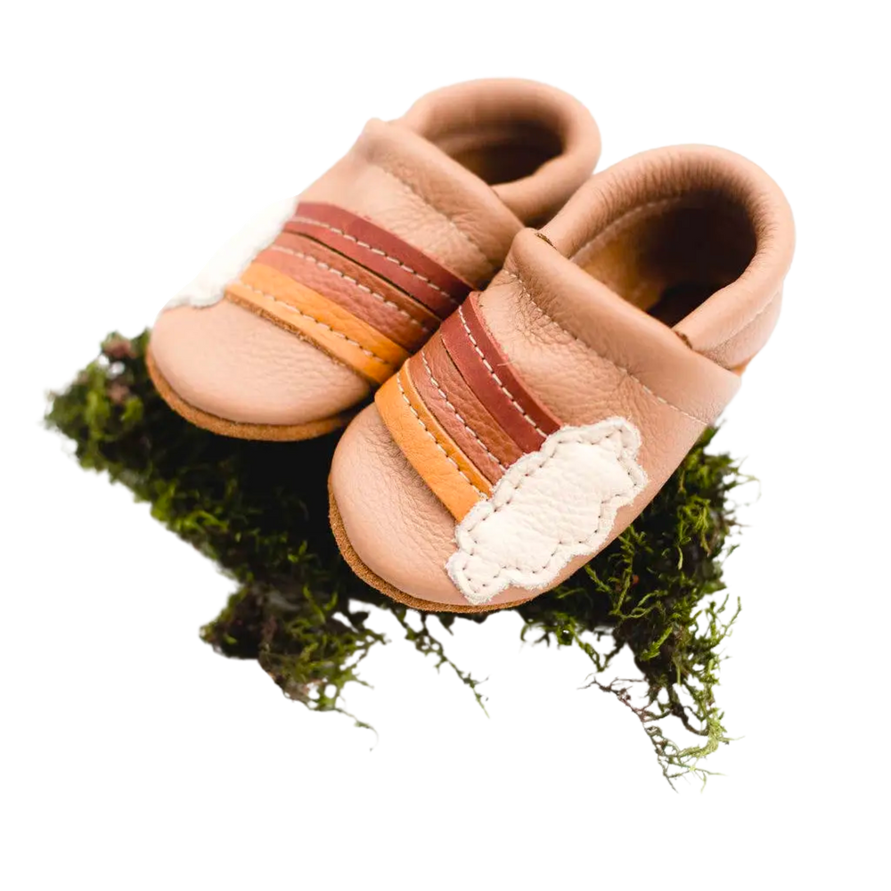 These shoes are handmade in Montana by a team of local women with high-quality 100% leather and suede. These shoes are great for ages newborn to 4 years. Soft and nonrestrictive for developing feet. Soft elastic band around the ankle. Perfect for balance when they start standing and walking & help keep socks on newborns. Suede bottoms help make non-slip for floors. 100% high-quality leather and suede.