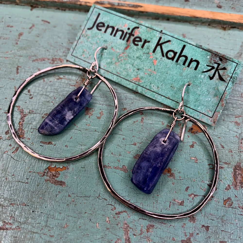 Kyanite blades are suspended by sterling wire from forged sterling hoops.