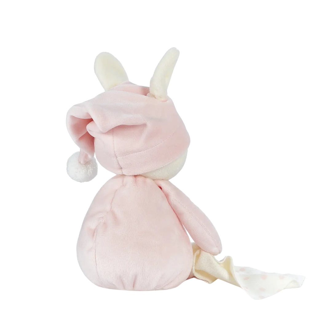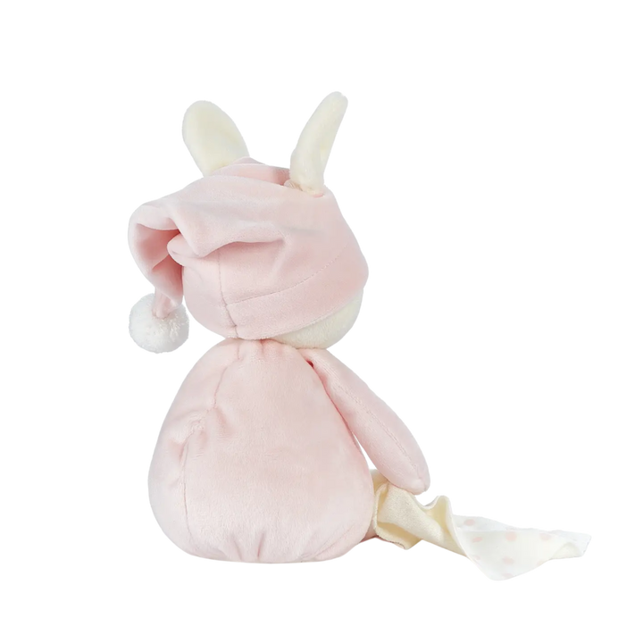 Drift off to dreamland with Sleepy Blossom Bunny, the softest and sweetest snuggle buddy for bedtime. With her gentle embroidered expression, plush pink and white velour body, and an adorable floppy stocking hat and blanket, this 10-inch bunny is designed to bring comfort and calm to every sleepy little one.