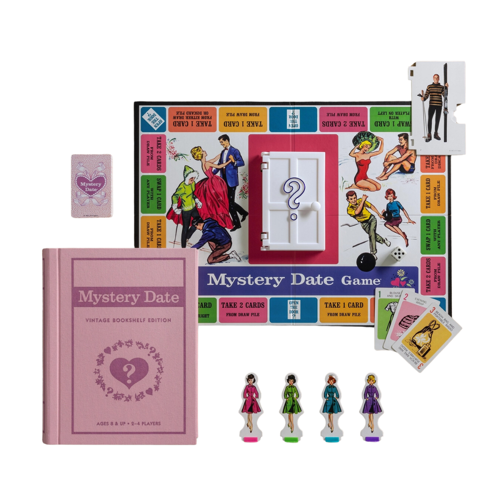 Step back into the swinging ’60s with this vintage edition of Mystery Date! A faithful reissue of the 1965 Milton Bradley classic, this game invites players to get ready for their dream date—while hoping they don’t open the door to the dreaded “Dud.” Packaged in a stylish fabric-wrapped book box, it’s as fun to display as it is to play.
